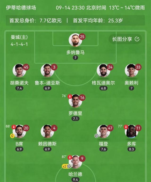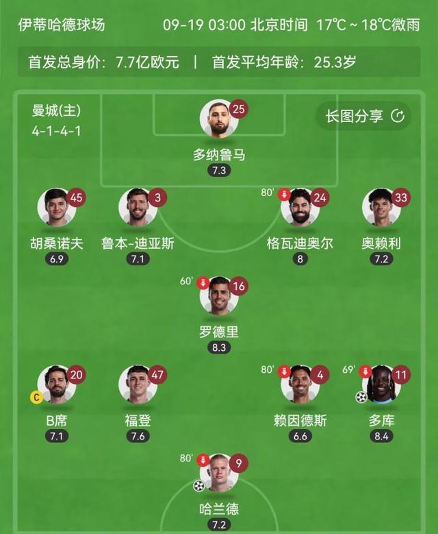 曼城3-0曼联首发:
