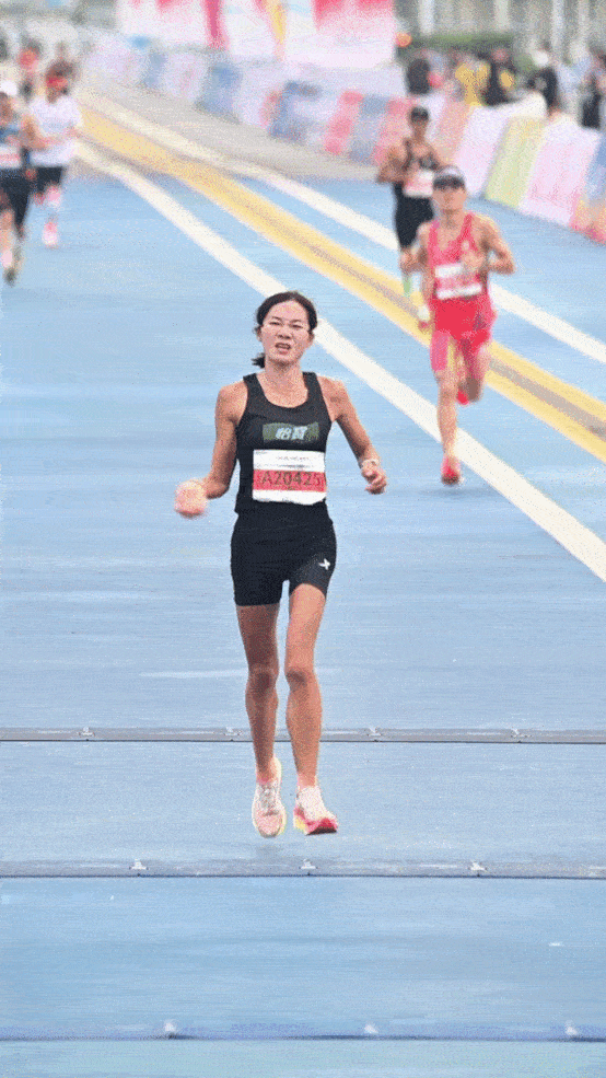 复盘比赛时,钟佳萌说,在中途20公里左右时,受气温升高影响,自己状态出现了波动——甚至一度有想停下来的冲动。在路边经历两次干呕后,她的配速一度掉到4分开外。但在退和不退的犹豫中,后来遇到同样跑崩的潘红,俩人开始互换着带跑,钟佳萌就此熬过最难过的一段赛道,并找到了节奏。最终,在后10公里开始发力的她追上了体制内的李丹,并最终拿下了女子大众第一的名次。