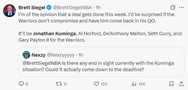 NBA记者Brett Siegel表示:我认为勇士与库明加的签约本周能达成。但勇士队如果不做出让步,让库明加以有球队选项的合同续约我会感到惊讶。我觉得新赛季的勇士队会同时拥有库明加、霍福德、梅尔顿、赛思-库里等人。