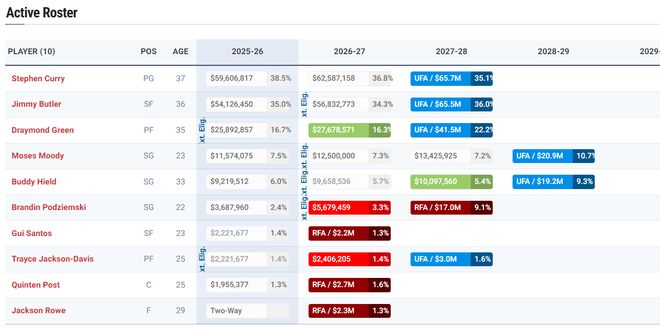 目前勇士队的大名单上还是9+1:库里、巴特勒、追梦、穆迪、希尔德、波杰姆斯基、桑托斯、戴维斯、波斯特;杰克逊-洛维(双向合同)