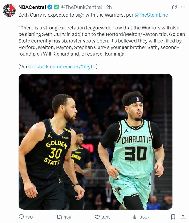 这与NBA记者马克-斯坦恩的报道不谋而合,马克-斯坦恩透露,整个联盟都知道勇士队除了会签下霍福德、小佩顿外,他们还将签下小库里、梅尔顿、二轮秀威尔理查德、库明加,也就是连续签下6人,这样勇士队进入训练营至少有15人。