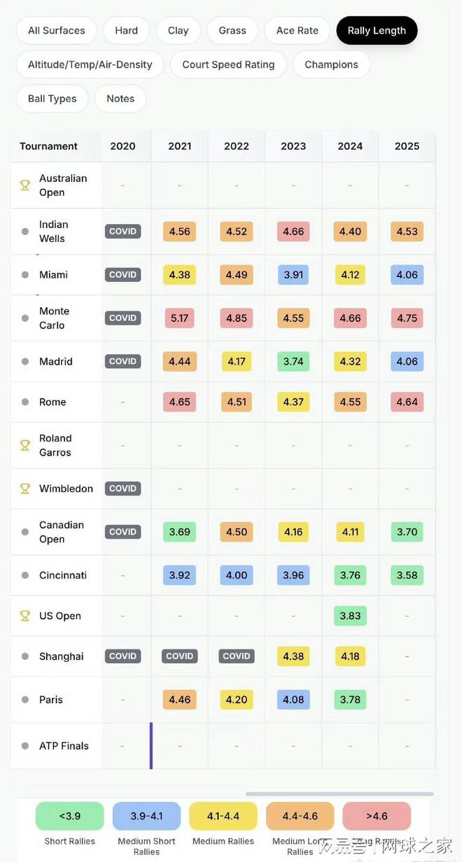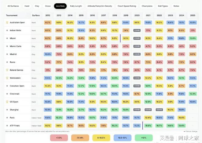 我们可以根据2025年赛季的数据来看看其中的关窍,以Ace球比例为例,法网约为6%,温网则高达12%左右;平均每分拍数也显示出类似趋势。