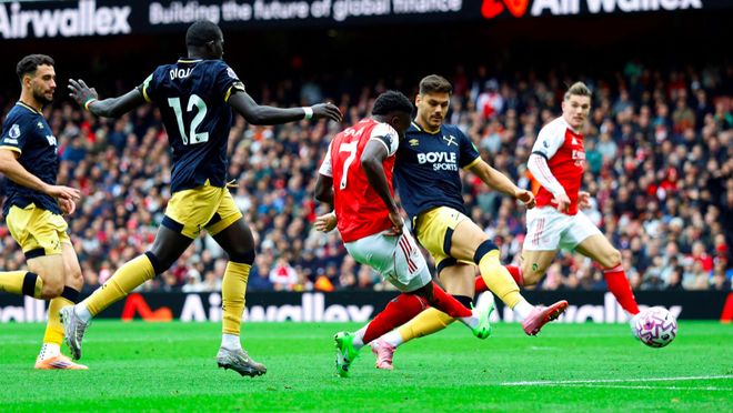 萨卡操刀主罚,稳稳命中,加上周中的欧冠,连场破门,萨卡的200场里程碑相当完美。
