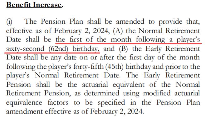 当然了,这并不是说姚明已经开始从NBA领养老金了,只是根据NBA劳资协议的规定,姚明已经有资格从NBA领取养老金,至于要不要开始领,可能确实要找伊戈达拉聊聊。NBA劳资协议条款里明确指出:正常退休日期应为球员62岁生日后的第一个月的第一天;但同样可以选择从45岁生日次月的第一天到正常退休日期前的任意一天。早领早受益,但同时每月领取的金额会按规定系数削减,晚领晚受益,相应的正常退休再领,每月可以领取全额,联盟自然是鼓励球员从正常退休日期开始领。