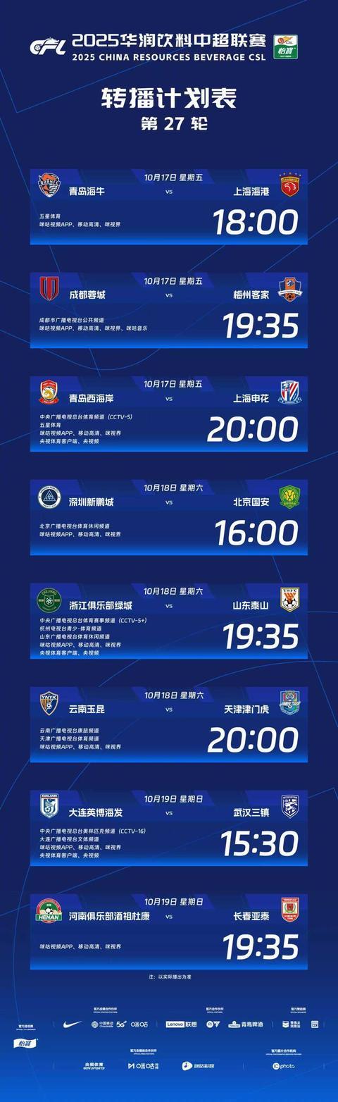 中超第27轮赛程,18日、19日的比赛,央视五套转播苏超,中超放在其余频道直播。