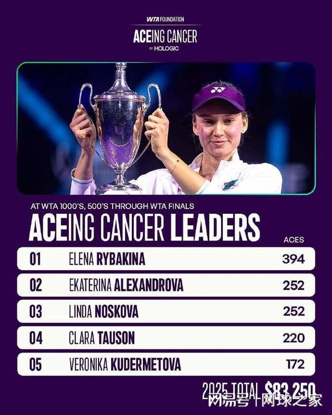 另外,北京时间昨天,WTA官宣了ACEing Cancer慈善活动年度报告。这项由WTA基金会与Hologic合作发起的活动旨在为癌症研究和致力于抗击女性癌症的非营利组织提供资金支持。在WTA1000、WTA500级别的比赛以及WTA年终总决赛当中,球员们发出的所有Ace球都将转化为捐款。本赛季,这项活动的捐款总额达到83250美元,其中,哈萨克斯坦名将莱巴金娜以394记Ace球位居榜首。