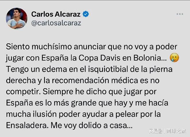 我们再来关注阿尔卡拉斯。北京时间昨晚,阿卡在社交媒体发文,正式宣布因伤退出戴维斯杯决赛圈的比赛,他的2025赛季宣告结束。