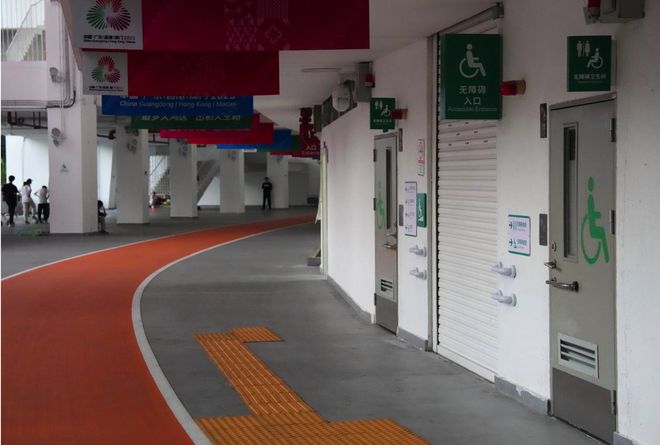 在深圳市体育中心,这里的台阶全部改造成平缓坡道,新增设的无障碍卫生间、淋浴间、轮椅坐席、盲文指引与语音导览地图无缝衔接。龙岗国际自行车赛场的改造更具针对性,新增防滑坡道、荧光盲道与智能升降平台,搭配高对比度标识与触觉导航设计,彻底避开了所有台阶障碍,为所有参赛运动员提供了贴心保护。