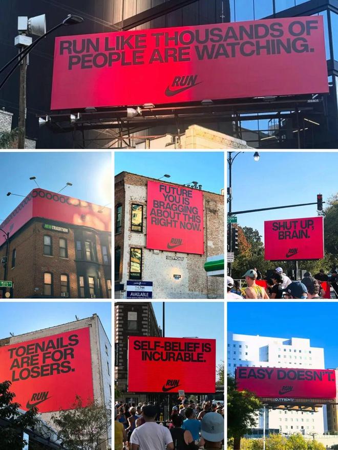 就夸到这里吧,接下来要泼点冷水。在我看来NIKE过于沉迷于“大字报广告”了,或者说NIKE在营销上过度在意形式了。虽然我能理解吃瓜群众真的很爱讨论广告文案,这波预算能带来很好的社媒话题,但其实围绕一场马拉松赛事的营销是多维度的,愿意在网上聊品牌文案的人其实只是跑者和马拉松跑者里的很小一撮人。