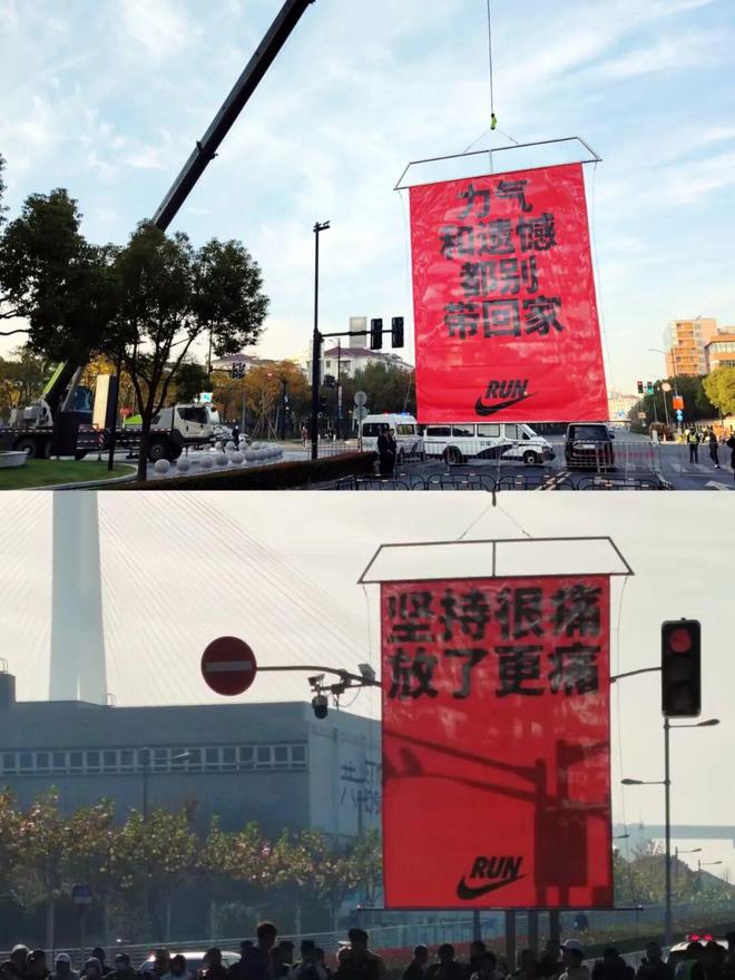 仅在上马赛道沿途,NIKE上天入地的大字报就多达十几幅,不得不承认,在平时看和在肌肉酸疼、意志力处于崩溃边缘时看,完全是两种感受。而且那么多句赛道文案,似乎总有那么一两句可以精准击中当时赛道上的你我。