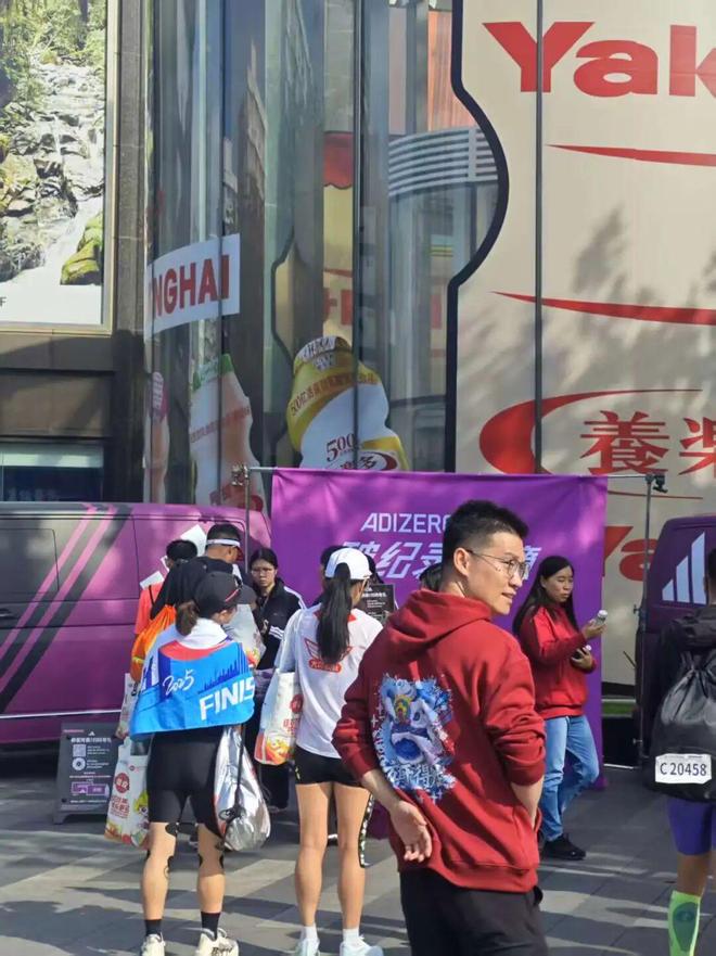 这次在万体馆出口对面的地铁站,我看到了一个阿迪达斯的巴士车休息站,这是一个很聪明的做法。每个跑完比赛的选手都是要离场的,如果在这个地方品牌能给每位要回家的选手一瓶饮料、一个周边或一句鼓励,我想是会给跑者带来一份额外惊喜的。