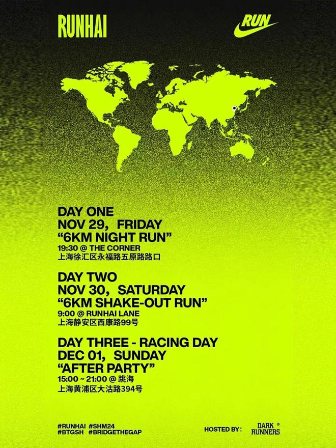 NIKE跑百巷、AR、HOKA、NB、Salomon、SUUTO、Tech Athletic、GARMIN、ON、轻功 & 迈胜、EKTOS、SN、The One Crew 、STAGE 2、Dark Runners、沈乌贼、跑者日历、GLOW、能跑、One Running X 二普纬度、OPC X 特步