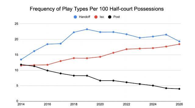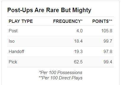 低位背打的数学戏法离开独行侠之后,波尔津吉斯在凯尔特人拿到了冠军戒指,这几个赛季,他的背身拿球已经成为了教练组不可忽视的重要武器。坐在老鹰的更衣室内,当被问及六年前卡莱尔的那番激烈言论时,他咧嘴笑了。"我确实记得那个采访,当时卡莱尔是对的。"在2019-20赛季,当波尔津吉斯低位背打并完成投篮、造成犯规、出现失误或传给射手时,独行侠队平均每次仅得0.92分,这在至少完成100次背打的46名球员中排名第37位。但最近几年,在华盛顿、波士顿以及现在的亚特兰大,波尔津吉斯在低位的效率大幅度提升,也成为了一位造犯规大师。自2022-23赛季开始以来,波尔津吉斯每次低位背打能得1.26分,这是同期至少完成200次背打的54名球员中的最佳效率。"如果(卡莱尔)现在说那句话,"波尔津吉斯说,"他很可能就错了。"虽然波尔津吉斯代表了最极端的例子,但低位背打的效率提升是全联盟范围内的现象。在2010年代的前三个赛季,任何包含低位背打的进攻每100次机会平均仅得89分。然而,自2022-23赛季以来,这个数字是每100次机会得103分,比整体半场进攻平均水平高出约4分。本赛季,这个差距甚至更大:包含低位背打的进攻每100回合得103.9分,而整体半场进攻每100回合得99.0分,相差4.9分。换句话说:如果一支球队每100次半场进攻机会能得到103.9分,那么它本赛季将在NBA排名第五。那如此说来,NBA应该全面反古吗?事实绝非如此。