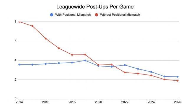 2019年12月,时任独行侠主帅卡莱尔解释了不让波尔津吉斯去到低位的原因,总结了新时代中低位背打的尴尬处境。"低位背打不再是好战术了,它就不是个好战术。对一个2.21米的家伙来说也不是。这是个低价值的进攻选择。我们必须认识到,比赛已经改变了。"卡莱尔说到。确实,在2010年代末期,NBA正处于巨大的战略变革之中,而低位背打是主要的牺牲品。在2013-14赛季,NBA每100次半场进攻中平均有11.8次低位背打,与面筐单打和手递手配合的频率大致相当。但自此之后,面筐单打和手递手的频率增加了50%以上,而低位背打却下降了三分之二,在2025-26赛季每100次半场进攻中只有4.0次。然而,在2020年代中期发生了一次奇妙的逆转。套用卡莱尔的话来说,比赛又变了回来:曾经被谴责为低效、低价值的战术,反而成为了这项运动中最高效的半场进攻方式,比单打好,比手递手好,甚至比老牌的挡拆还要好。低位背打是约基奇、文班亚马和坎宁安等球星展示其精湛脚步和一对一统治力的载体。而且,它也是击败现代防守并赢得比赛的一种方式。"当你懂得如何正确使用它时,"德罗赞说,"低位背打是致命的。"