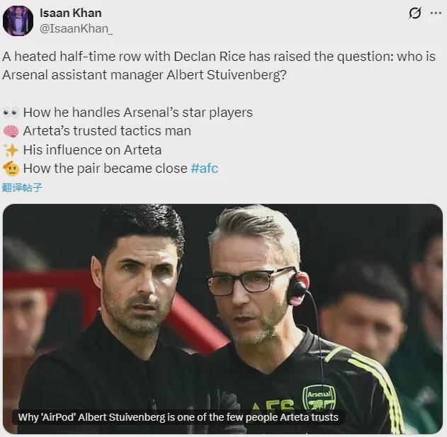 比赛中除了乔弗,可以说上镜率最高的教练组成员就是斯图文博格了,我们经常能看到他在技术区和阿尔特塔一起讨论,而且这么多年了,阿尔特塔一直把他留在身边,说是心腹爱将也不为过。